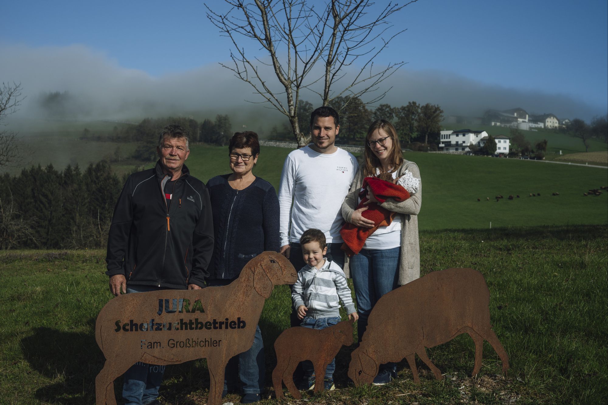 Seit Generationen betreiben wir eine Landwirtschaft mit Milchkühen, seit 1995 geführt von Kurt und Regina Großbichler. Aktuell steigt auch die junge Generation ein, Markus Großbichler, drittes von vier Kindern, und hinterlässt bereits seine Spuren im Betrieb. Er hat den Umstieg auf Juraschafzucht begonnen und kümmert sich um die 80 Mutterschafe und ihre Lämmer.